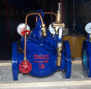 900X緊急關閉閥當出口壓力低于導閥設定的壓力時,導閥此時處于開通狀態,主閥上腔壓力與主閥出口壓力相等,進口與吃口存在壓差,水流經閥口出口流出,當消防泵氣泵時,或變平泵壓力升高時,超過導閥設定壓力,由主閥進口向導閥管控制室壓力升高,作用在彈簧壓力增大,向下壓緊,帶動閥芯下移,使導閥關閉,此時主閥進口壓力通過節流閥補充到主閥閥蓋上腔,因閥瓣受到向下壓力大于向上推力,主閥關閉。值得注意的是,進口壓力小于設定壓力是,主閥處于開啟狀態,進口壓力大于設定壓力,閥瓣關閉。